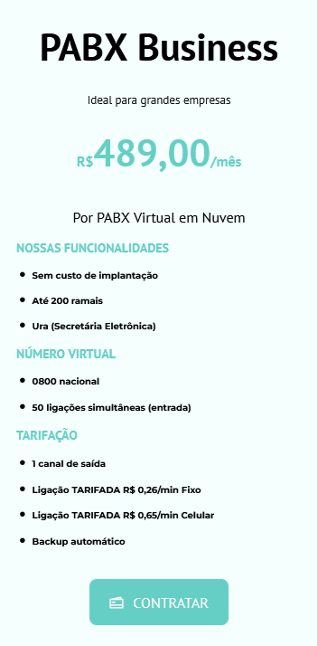 Por PABX Virtual em Nuvem NOSSAS FUNCIONALIDADES - Sem custo de implantação - Até 200 ramais - Ura (Secretária Eletrônica) NÚMERO VIRTUAL - 0800 nacional - 50 ligações simultâneas (entrada) TARIFAÇÃO - 1 canal de saída - Ligação TARIFADA R$ 0,26/min Fixo - Ligação TARIFADA R$ 0,65/min Celular - Backup automático Após a Confirmação do Pagamento da Adesão Nossa Equipe de Engenharia Vai Agendar com você a instalação e a apresentação da console de uso.