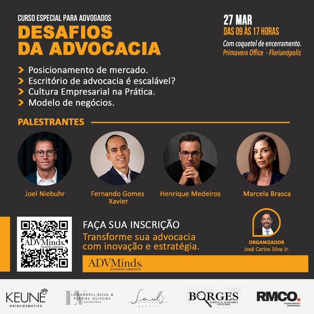Em um cenário jurídico cada vez mais competitivo, o sucesso vai além da expertise técnica. Ele reside na capacidade de inovar, gerir e posicionar sua prática como um verdadeiro negócio de vanguarda.Convidamos você para o Desafios da Advocacia, um curso exclusivo que irá redefinir sua visão sobre gestão e estratégia no universo jurídico. Junte-se a um grupo seleto de profissionais em um dia de profundo aprendizado e networking de alto nível.Explore temas essenciais com especialistas renomados e descubra como aplicar na prática conceitos de posicionamento, escalabilidade, cultura empresarial e modelos de negócios inovadores.Este não é apenas um curso, é um investimento na sua carreira e no futuro do seu escritório.