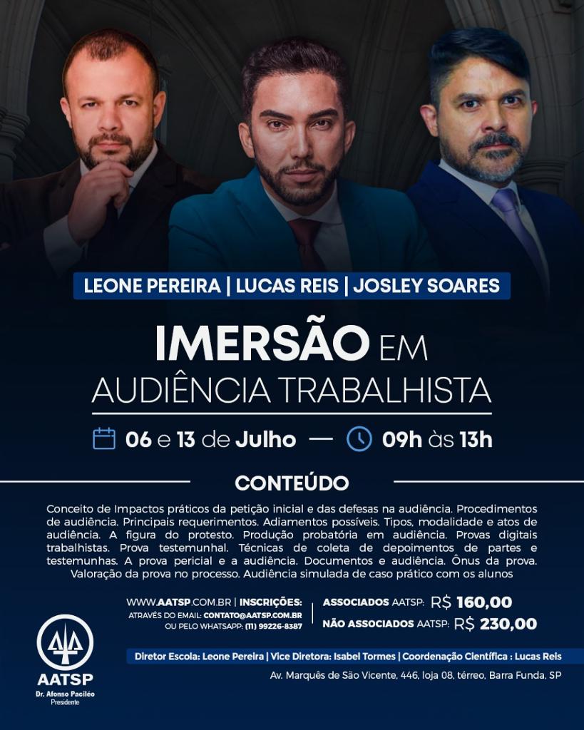 IMERSÃO EM AUDIÊNCIA TRABALHISTA - PRESENCIAL - DIAS 06 E 13/07/2024 - 09 ÀS 13 HORAS (ASSOCIADOS)