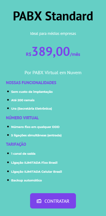 Por PABX Virtual em Nuvem NOSSAS FUNCIONALIDADESDES - Sem custo de implantação - Até 200 ramais - Ura (Secretária Eletrônica) NÚMERO VIRTUAL - Número fixo em qualquer DDD - 5 ligações simultâneas (entrada) TARIFAÇÃO - 1 canal de saída - Ligação ILIMITADA Fixo Brasil - Ligação ILIMITADA Celular Brasil - Backup automático Após a Confirmação do Pagamento da Adesão Nossa Equipe de Engenharia Vai Agendar com você a instalação e a apresentação da console de uso.