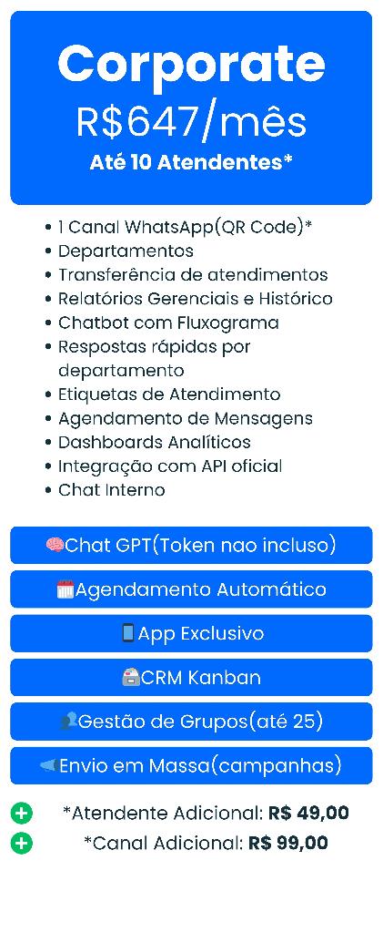 Plano oibot+ | CORPORATE 10 Atendnetes + 1 conexão + Agendamento auto + App + CRM + Grupos + Disparo