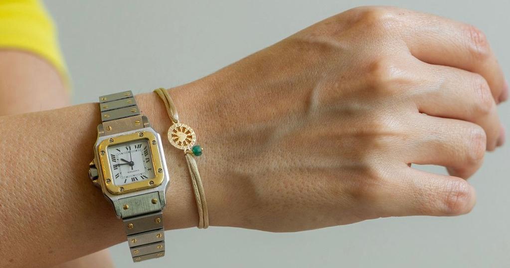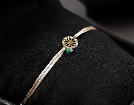 Pulseira, medalha em Ouro Amarelo 18k, Esmeralda na lapidação Briolet e fio de seda. *Envio por Sedex em ate 7 dias uteis*