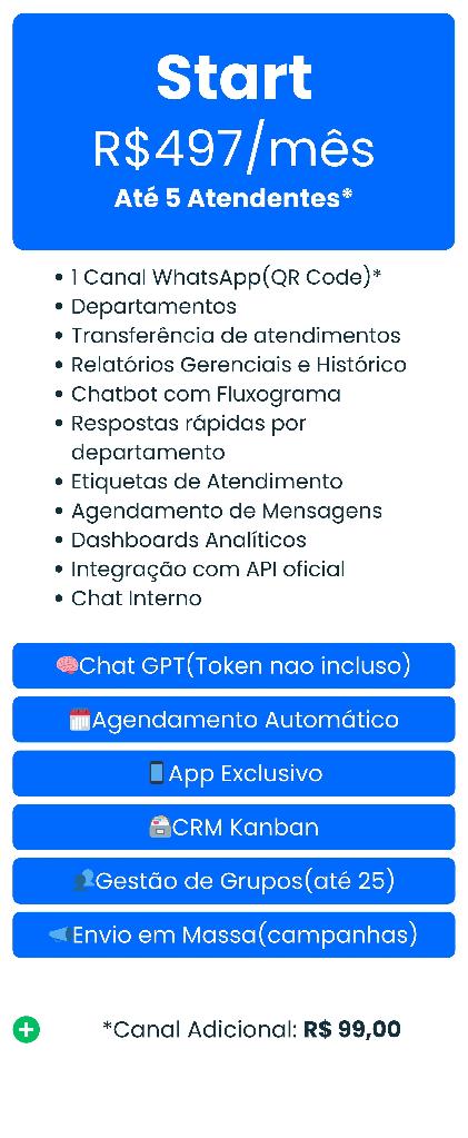 Plano oibot+ | START 5 Atendnetes + 1 conexão + Agendamento auto + App + CRM + Grupos + Disparo