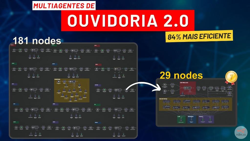 Evolução do sistema de ouvidoria! A versão 2.0 traz mudanças significativas: redução de 181 para 29 nodes (84% mais leve), substituição de HTTP Requests por Agent Tools, fluxo mais assertivo e organizado, mesma funcionalidade com muito menos complexidade, sistema de protocolo sequencial automatizado e integração otimizada com Google Sheets.
